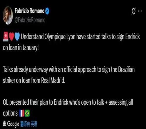 据知名转会记者罗马诺消息,法甲豪门里昂已就冬窗租借恩德里克与皇马展开谈判。这家法甲俱乐部已向皇马递交了正式的租借方案,并向球员本人介绍了球队计划与定位,恩德里克愿意继续沟通,并权衡所有选项。