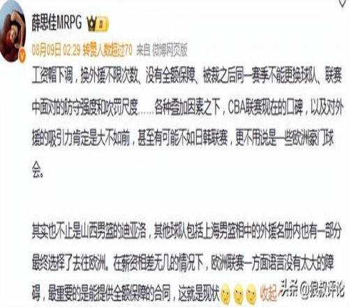 媒体人付政浩曾发文点评:工资帽下调,换外援不限次数、没有全额保障、被裁之后同一赛季不能更换球队、联赛中面对的防守强度和吹罚尺度……各种叠加因素之下,CBA联赛现在的口碑,以及对外援的吸引力肯定是大不如前,甚至有可能不如日韩联赛,更不用说是一些欧洲豪门球会。